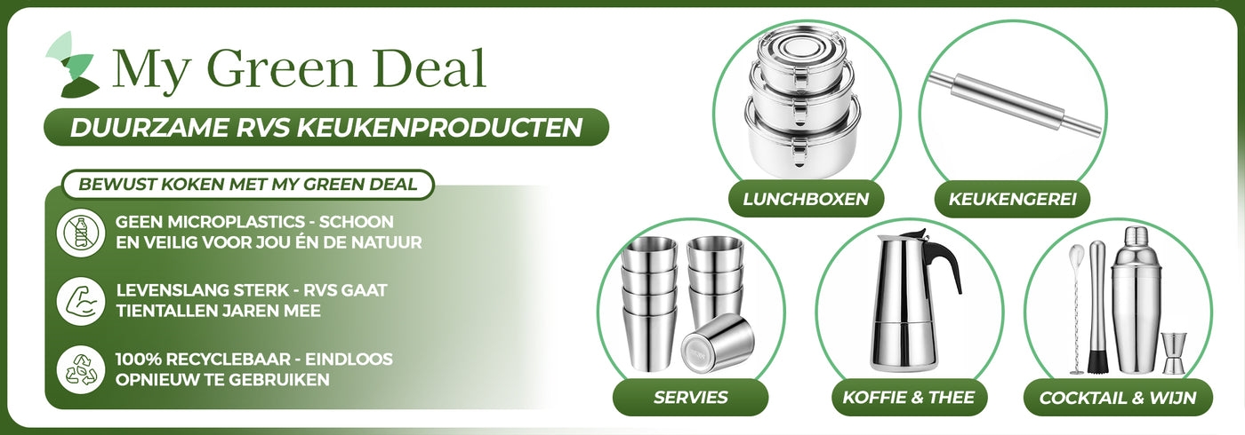 My Green Deal maakt duurzaam kiezen makkelijk: hoogwaardige RVS keukenproducten, snelle levering en persoonlijke service. We focussen op veilige materialen (Premium 304 RVS), minder plastic in huis en producten die jarenlang meegaan.