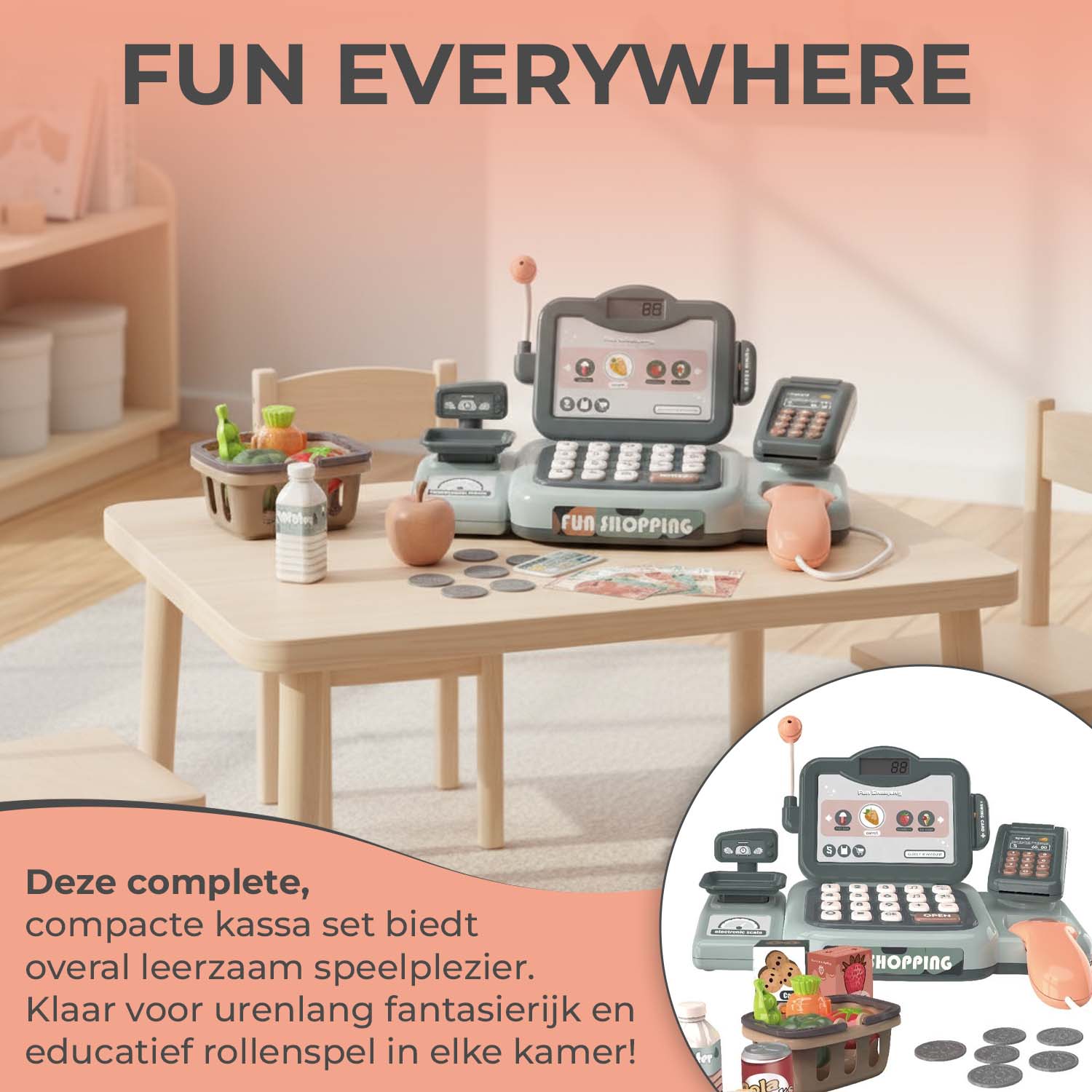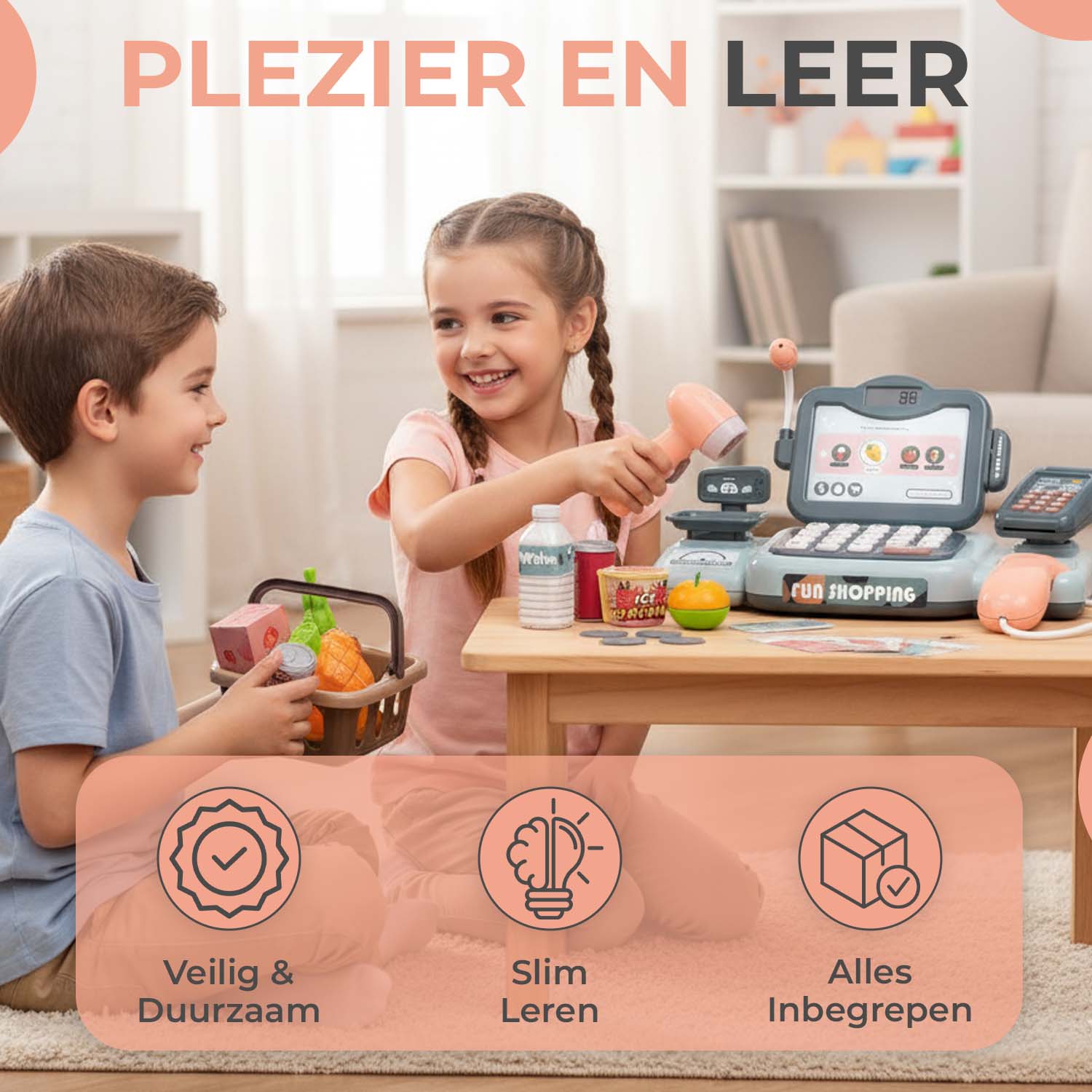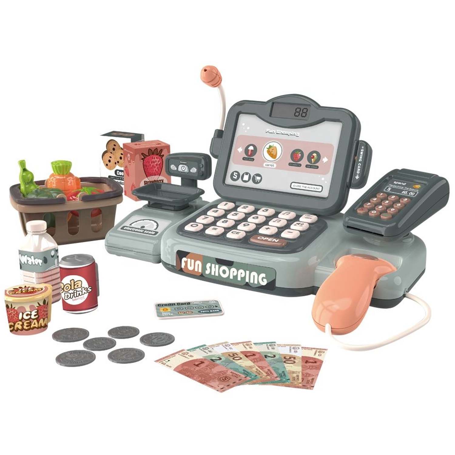 Speelgoed kassa met accessoires voor rollenspel. Inclusief scanner, microfoon, pinautomaat, winkelmandje, speelgeld, muntjes en etenswaren. Gemaakt van kunststof in grijs/oranje tinten. Afmetingen ca. 31 × 15 × 18,5 cm. Werkt op batterijen.
