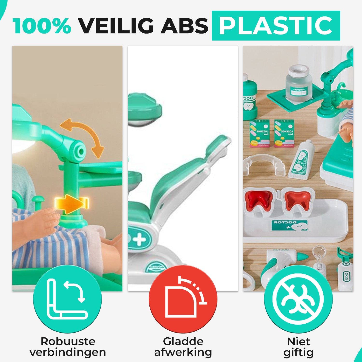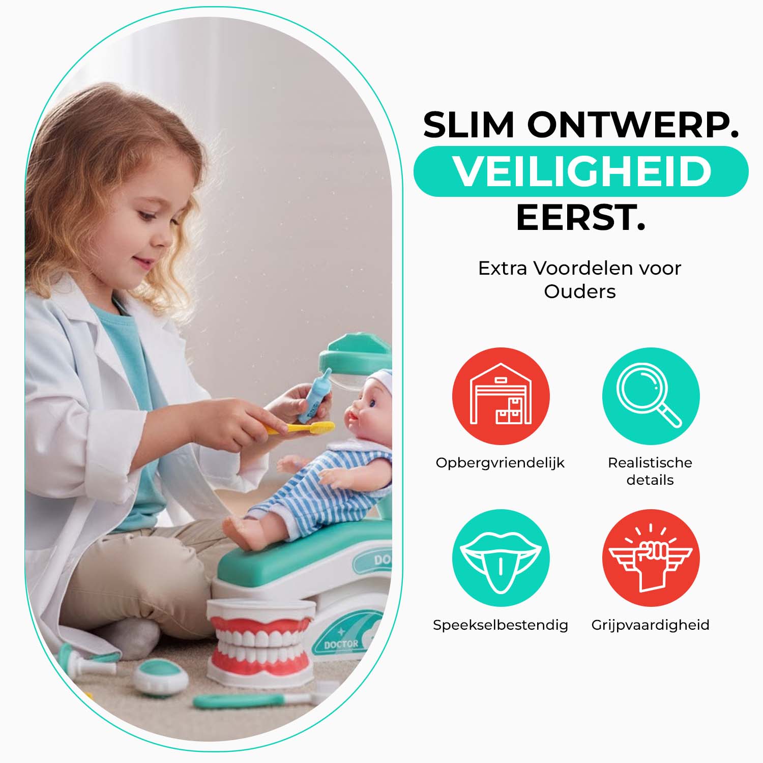 et deze uitgebreide tandarts speelgoedset stappen kinderen in de wereld van de tandarts. De set bestaat uit een realistische tandartsstoel, een baby-pop, grote kiesmodellen en een complete verzameling tandartsgereedschap. Ideaal voor rollenspel, fantasie en urenlang educatief speelplezier. Kinderen leren op een speelse manier hoe een tandarts werkt en kunnen zelf onderzoeken, poetsen, behandelen en “patiënten” helpen.