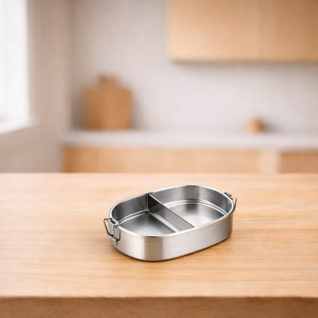 Deze RVS lunchbox ovaal met 2 compartimenten van My Green Deal is ideaal voor het gezond, overzichtelijk en duurzaam meenemen van maaltijden. Perfect te gebruiken als lunchbox RVS, broodtrommel, snackbox of voor meal prep bakjes. Dankzij het compacte, ovale formaat past hij moeiteloos in elke tas, terwijl de inhoud van 500 ml voldoende ruimte biedt voor lunch, snacks of restjes.