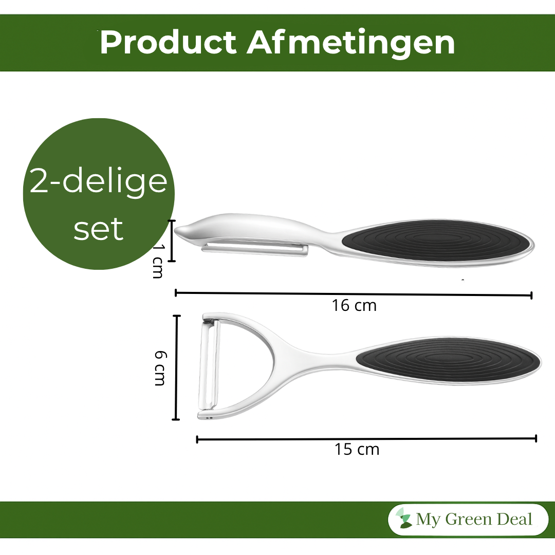 Maak groente en fruit bereiden eenvoudiger met de My Green Deal RVS Dunschiller Set van 2. Deze set bevat zowel een verticale schiller (16 × 1 cm) als een horizontale schiller (15 × 6 cm) – ideaal voor aardappels, wortels, komkommers, courgettes en meer. Dankzij het scherpe roestvrijstalen mes schil je moeiteloos en nauwkeurig, terwijl het ergonomische antisliphandvat zorgt voor comfort en controle.