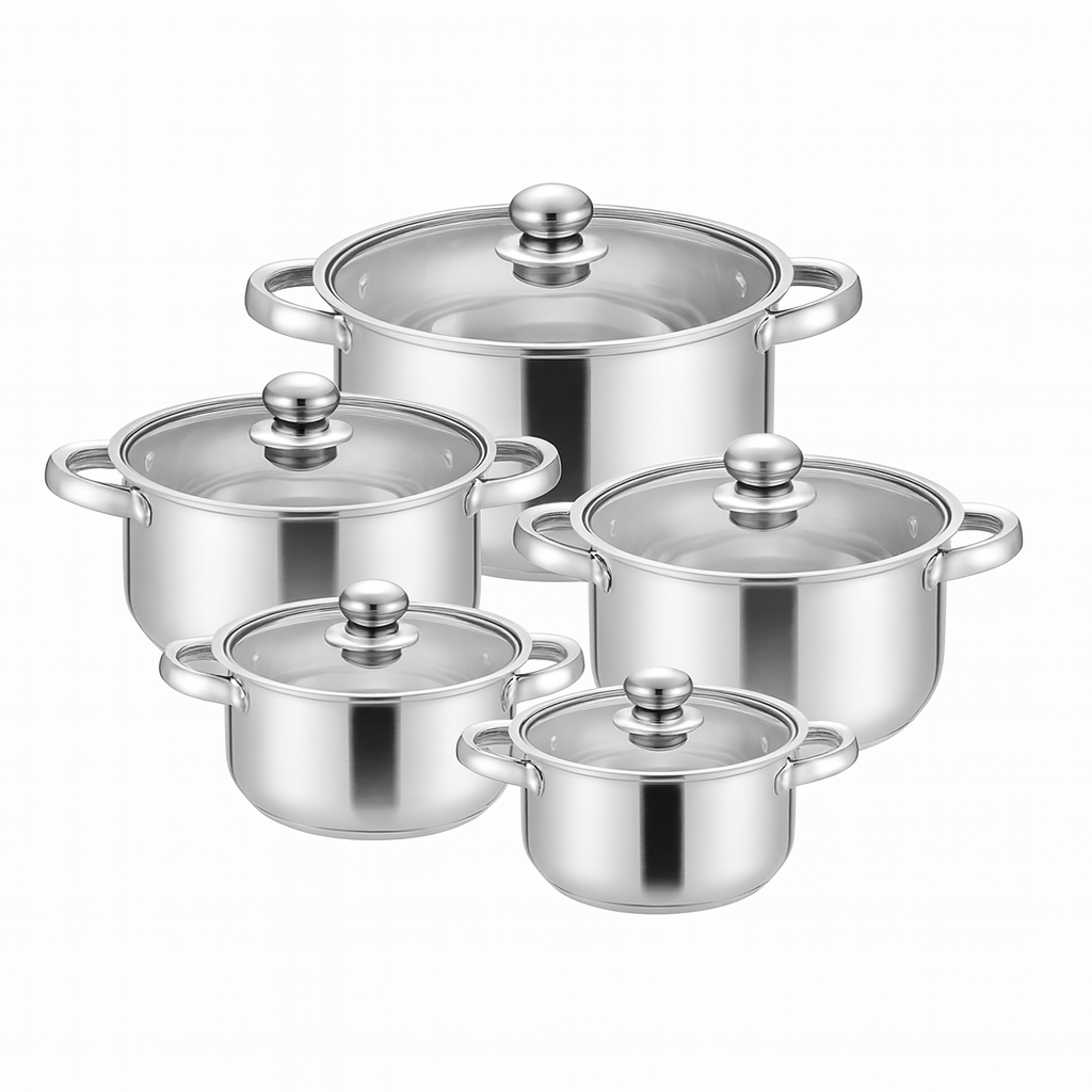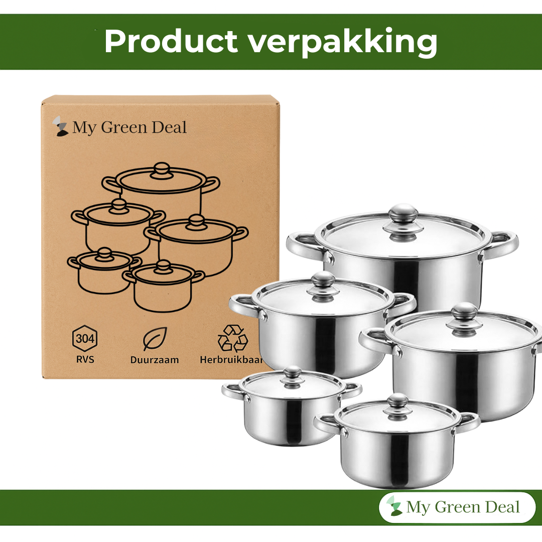 De My Green Deal RVS Kookpottenset is de complete basis voor iedere keuken. Deze set bestaat uit 5 kookpannen in verschillende maten, elk voorzien van een passend deksel. Gemaakt van hoogwaardig roestvrijstaal – stevig, hygiënisch en geschikt voor alle warmtebronnen, inclusief inductie. Perfect voor koken, stoven en sudderen.
