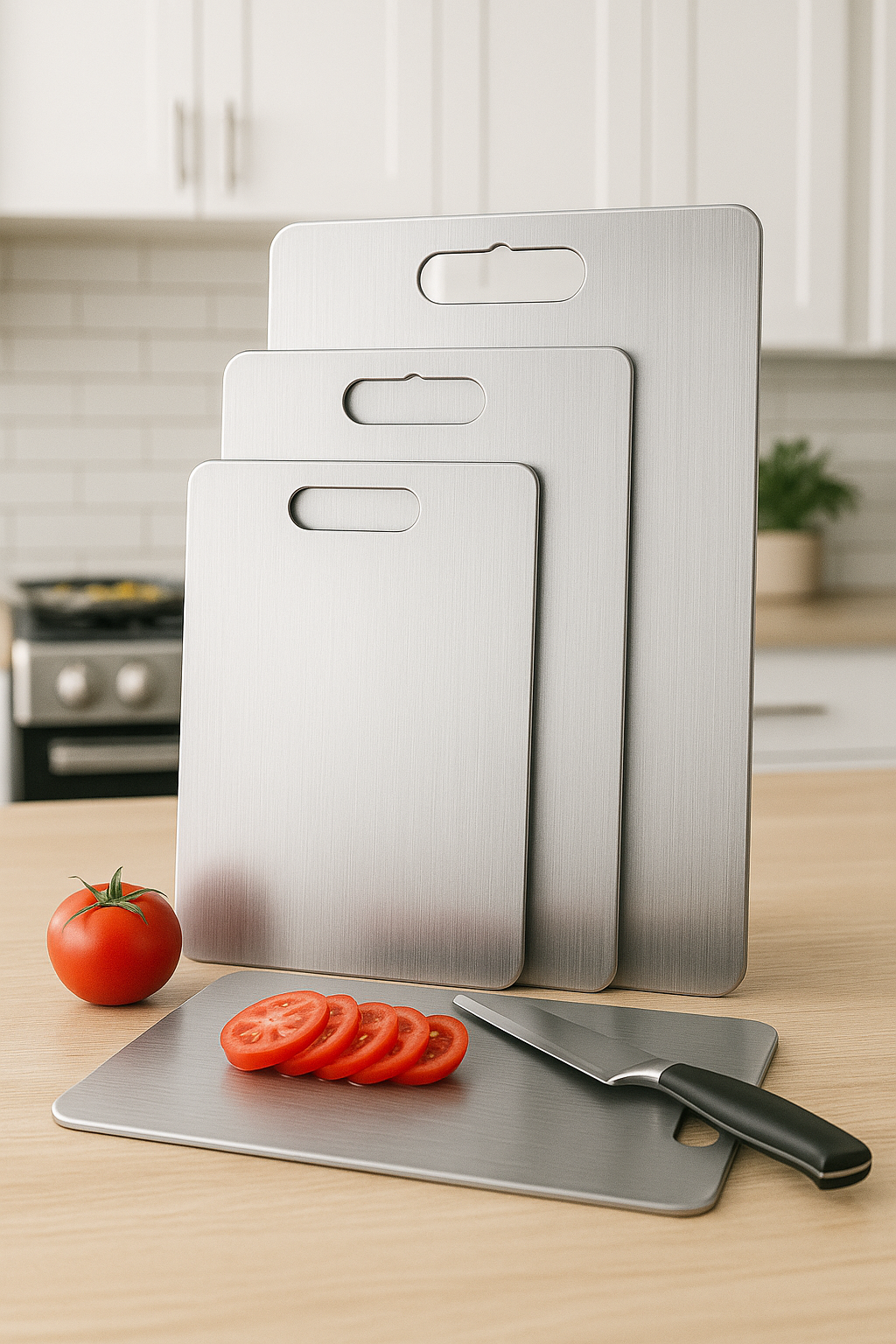 Til je keuken naar een hoger niveau met de My Green Deal RVS Snijplanken Set (3-delig). Deze stevige, hygiënische planken zijn ideaal voor het snijden van groenten, vlees, brood of fruit. De snijplanken zijn vervaardigd uit hoogwaardig roestvrij staal – een duurzaam en stijlvol alternatief voor houten of plastic varianten die snel slijten of bacteriën vasthouden.