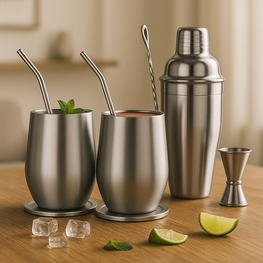 De bekers houden je drankjes langer koel of warm, de cocktailshaker zorgt voor perfect gemixte cocktails en de onderzetters maken de look helemaal af. Duurzaam, elegant en eindeloos herbruikbaar – een stijlvolle upgrade voor je homebar.