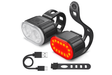 Set fietsverlichting bestaande uit een voorlamp met witte LED en een achterlamp met rode LED. Bevestiging met siliconen banden. Behuizing van kunststof in zwart. Oplaadbaar via USB. Afmetingen per lamp ca. 7 × 4 × 3 cm.
