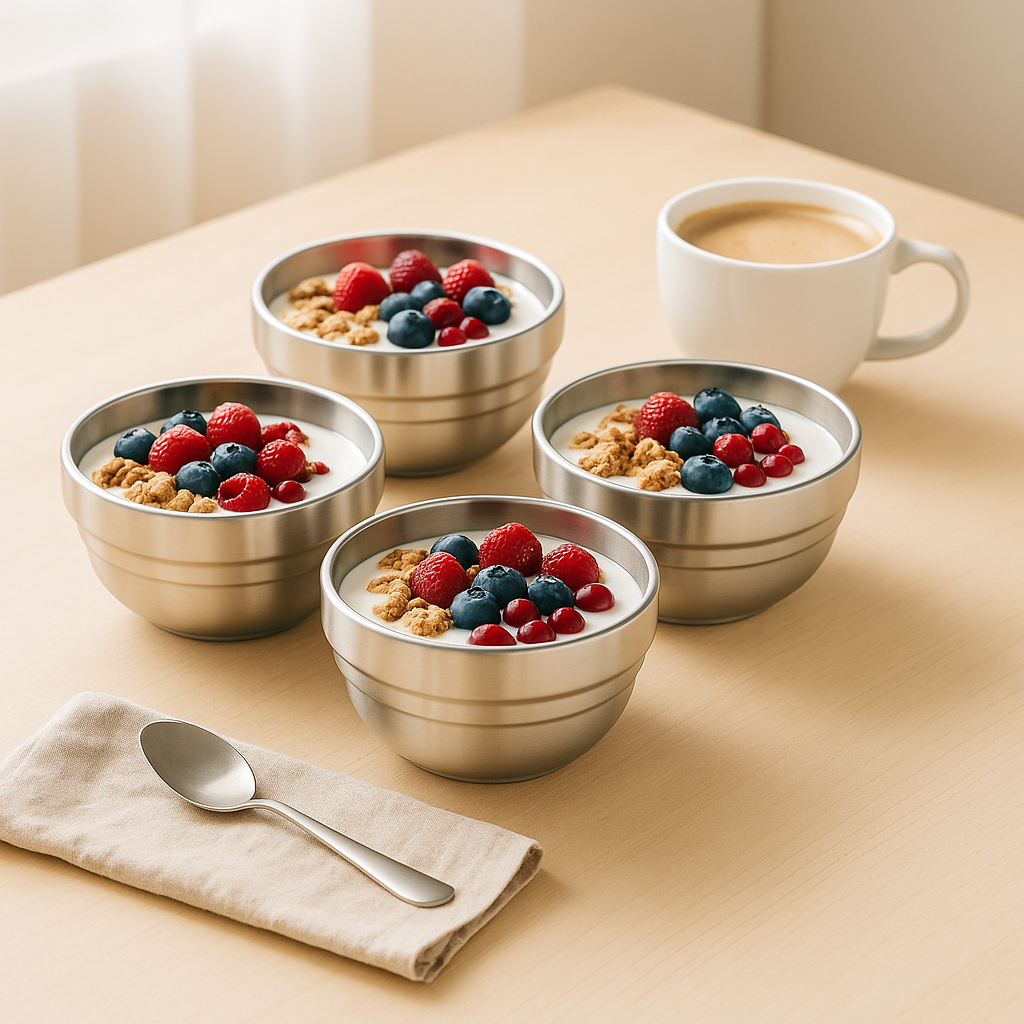 Plastic en glazen schaaltjes kunnen snel breken of microplastics afgeven. De My Green Deal RVS Kommetjes bieden een robuust en milieuvriendelijk alternatief dat jarenlang meegaat. Ze zijn bestand tegen hitte, kou en intensief gebruik – zonder te verkleuren of te vervormen.