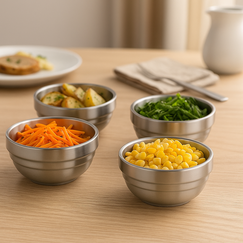 De My Green Deal RVS Kommetjes Set (4-delig) is de perfecte toevoeging aan elke tafel. Gebruik deze stijlvolle en duurzame kommetjes voor snacks, dips, sausjes, nootjes of kleine bijgerechten. Gemaakt van hoogwaardig roestvrij staal, waardoor ze stevig, hygiënisch en volledig vrij van plastic zijn – ideaal voor dagelijks gebruik, feestjes of buiten dineren.