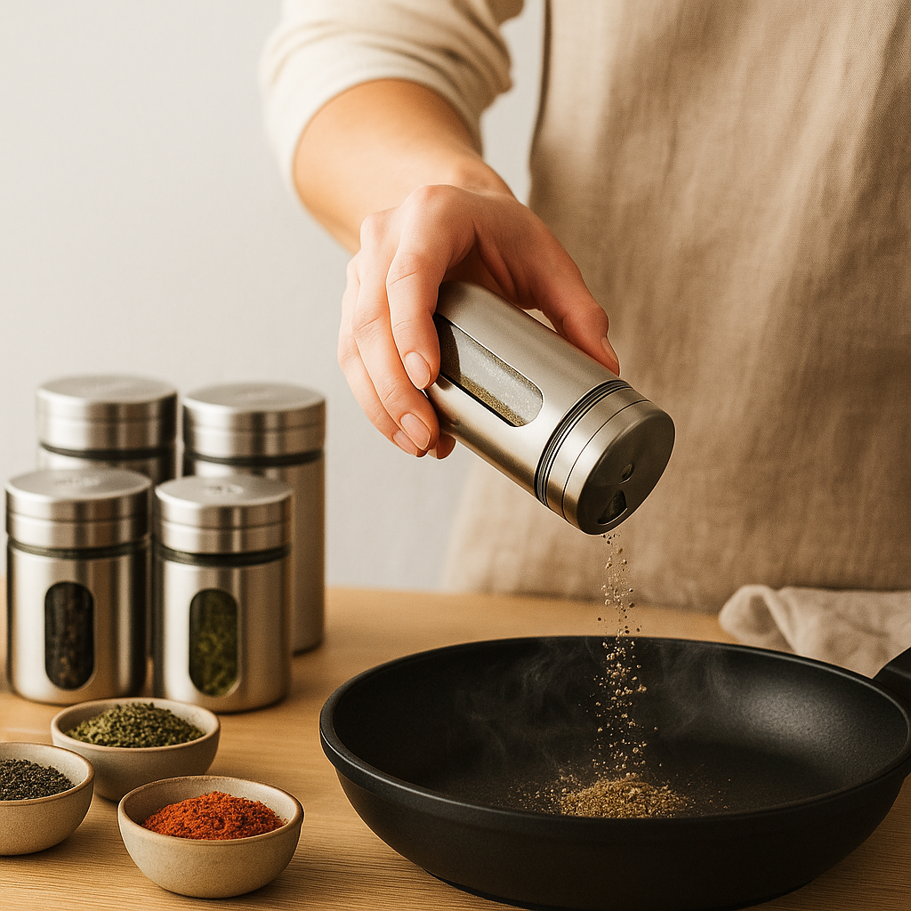 Breng orde, stijl en overzicht in je keuken met de My Green Deal RVS Kruidenpotjes Set (12-delig). Deze luxe set bestaat uit twaalf duurzame kruidenstrooiers van hoogwaardig roestvrij staal – ideaal voor het bewaren van kruiden, specerijen, zout of peper. Dankzij het slimme draaideksel met drie strooistanden bepaal je zelf eenvoudig de juiste hoeveelheid bij het koken of bakken.
