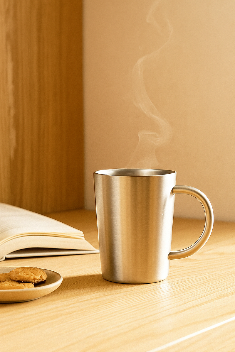 Ontdek onze RVS mok, onderzetters en theezeef – een elegante set ontworpen voor wie van pure eenvoud houdt.