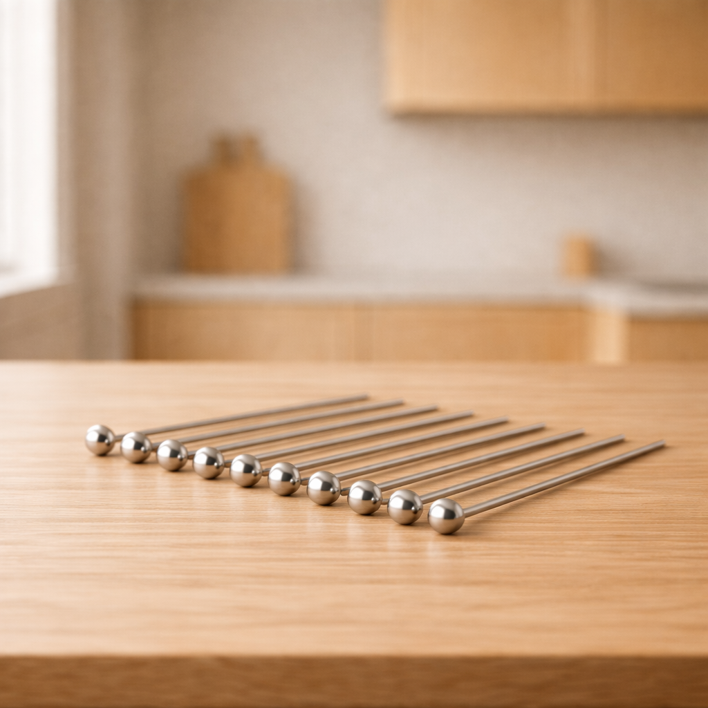 De cocktailprikkers zijn gemaakt van hoogwaardig Premium 304 RVS, wat zorgt voor een stevige, roestvrije en duurzame kwaliteit. Dankzij het slanke ontwerp prik je moeiteloos ingrediënten zonder splinters of breken, zoals bij houten prikkers. Het minimalistische zilveren design past perfect bij elke moderne, Scandinavische of industriële tafelsetting of thuisbar.